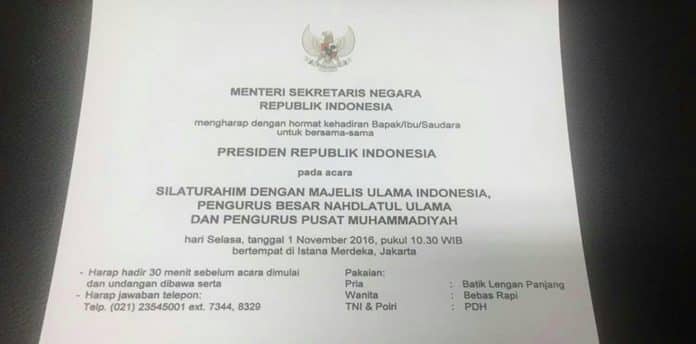 Acara ini sendiri akan digelar di Istana Merdeka Jakarta, 1 November 2016, kurang lebih jam 10.30. Kemungkinan ada beberapa tokoh yang diundang, khususnya dari Muhammadiyah, NU dan MUI. Selain itu, elemen TNI dan Polri juga mendapatkan undangan. Kuat dugaan, undangan silaturahmi ini berkaitan dengan aksi besar-besaran yang akan dilakukan eleman umat islam pada 4 November mendatang.