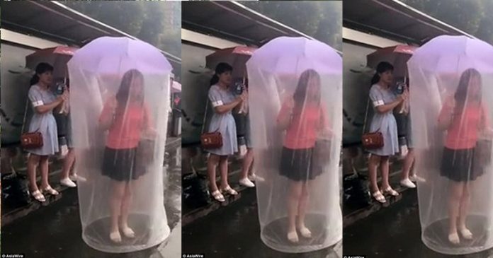 Tak hanya melindungi kepala saja, payung yang dia kenalan dapat dipastikan bisa melindungi tubuhnya dari kepala sampai kaki. Ya, payung tersebut ditambahi plastik yang menjulur sampai ke tanah.