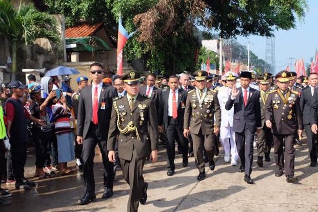 Nawacita – Presiden Joko Widodo yang terhambat kemacetan lalu lintas, berjalan kaki untuk mencapai tenda kehormatan Upacara Peringatan HUT Ke-72 TNI di Dermaga Indah Kiat Cilegon, Banten, Kamis (5/10/2017).