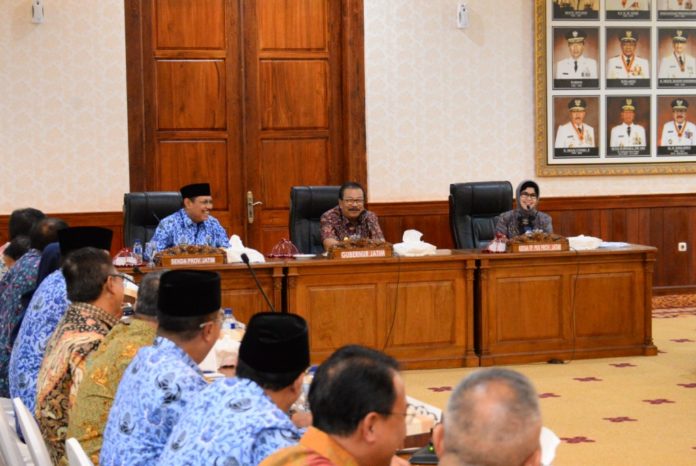 Gubernur Jatim Dr.H. Soekarwo Beserta Isteri Dra. Nina Soekarwo dan Sekda Jatim Dr.H. Akhmad Sukardi (kiri) Saat Rapat Koordinasi Persiapan Pelaksanaan Inspeksi Visual Asam Asetat (Iva) Tes di Gedung Negara Grahadi Surabaya, Selasa (17/10/2017). dny