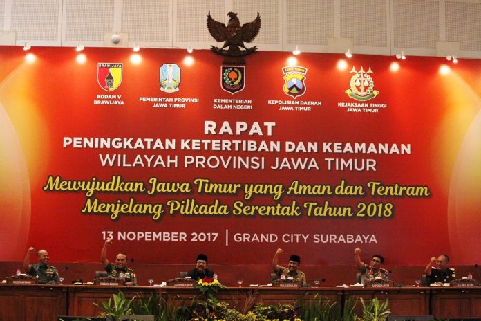 “Tiga pilar di kecamatan ini harus saling mendukung, sehingga segala konflik yang mungkin timbul jelang maupun saat pelaksanaan pilkada serentak nanti cukup diselesaikan di tingkat kecamatan,” ungkap Pakde Karwo Sapaan akrab Gubernur Jatim pada acara Rapat Peningkatan Ketertiban dan Keamanan Wilayah Provinsi Jatim, di Grand City Convex, Surabaya, Senin(13/11/2017).