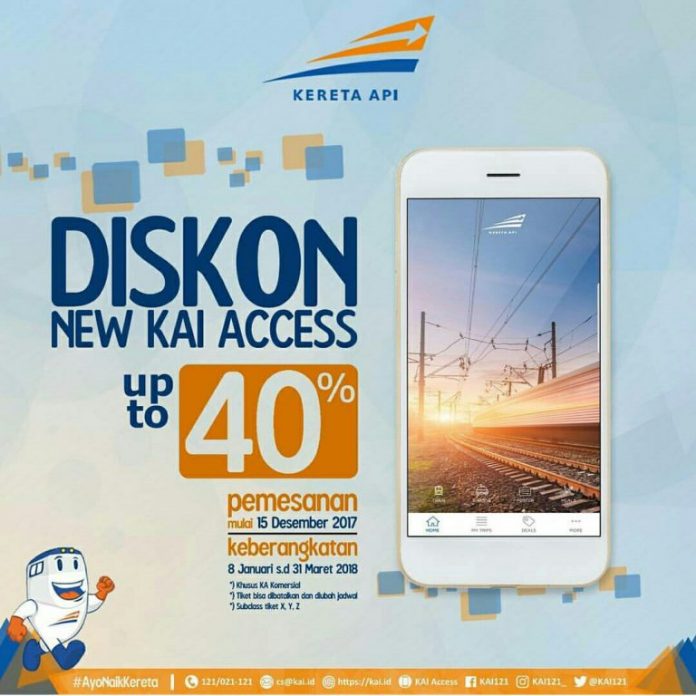Surabaya,Nawacita.co – Kabar gembira bagi pelanggan kereta api yang menggunakan aplikasi pemesanan tiket KA, KAI Access. PT Kereta Api Indonesia (Persero) memberikan diskon hingga 40% dari harga normal kepada penumpang KA komersial (eksekutif, bisnis, maupun ekonomi) / non PSO se-Jawa/Sumatera yang memesan tiket via aplikasi KAI Access versi terbaru. Promo tersebut berlaku untuk kereta-kereta komersial keberangkatan mulai 8 Januari 2018 sampai 31 Maret 2018.