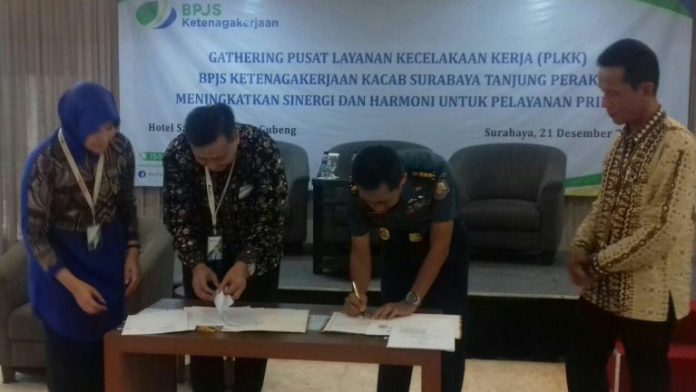 Pada kegiatan gathering ini dilakukan penandatanganan perjanjian kerjasama antara BPJS Ketenagakerjaan Kantor Cabang Surabaya Tanjung Perak dengan Kadiskes Lantamal V Surabaya yang membawahi 11 Klinik.