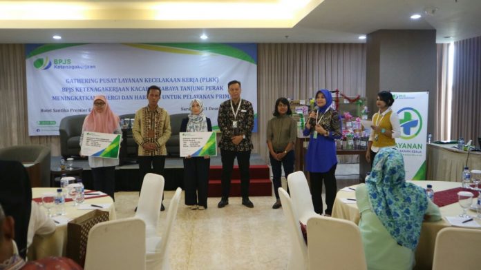 Surabaya,Nawacita.co – BPJS Ketenaga kerjaan cabang Surabaya mengadakan Gathering pusat layanan kerja yang dibawahi naungan BPJS ketenagakerjaan Surabaya cabang tanjung perak, acara ini diadakan di hotel santika premiere gubeng Surabaya (21/12/2017) .hari ini penyerahkan secara simbolis untuk client .jadi hari ini ada penyerahan Jaminan senilai Rp 2.500.000.000 kepada jumlah kecelakaan kerja hari ini juga ada sekitar 20 klinik mendatangani IKS ( ikatan kerja sama ) dengan BPJS Ketenagakerjaan untuk perluasan dari pusaran kecelakaan kerja menangani kasus kecelakaan kerja seluruh Surabaya .