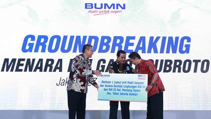 Jakarta, Nawacita – Menteri BUMN Rini M Soemarno bersama Komisaris Utama Bank BRI Andrinof A.Chaniago, Direktur Utama Bank BRI Suprajarto, Direktur Utama PP Ir. Tumiyana, MBA, Jaksa Muda Bagian Intelejen DR dan Jan Samuel Maringka, Kapuskeu Mabes Polri Bambang Giri bersama-sama melakukan ground breaking gedung baru PT Bank Rakyat Indonesia (Persero) Tbk di kawasan “Segitiga Emas” Jakarta, yakni di Jalan Jenderal Gatot Subroto nomor 62. Gedung yang diberi nama Menara BRI Gatot Subroto tersebut akan menempati lahan seluas 8.589 meter persegi dengan luas konstruksi mencapai 95.437 meter persegi. “Gedung ini merupakan salah satu upaya perseroan untuk optimalisasi aset. Di sisi lain, dengan adanya gedung baru maka akan meningkatkan efisiensi karena saat ini masih terdapat unit kerja BRI di wilayah Jakarta yang statusnya sewa,” urai Suprajarto.