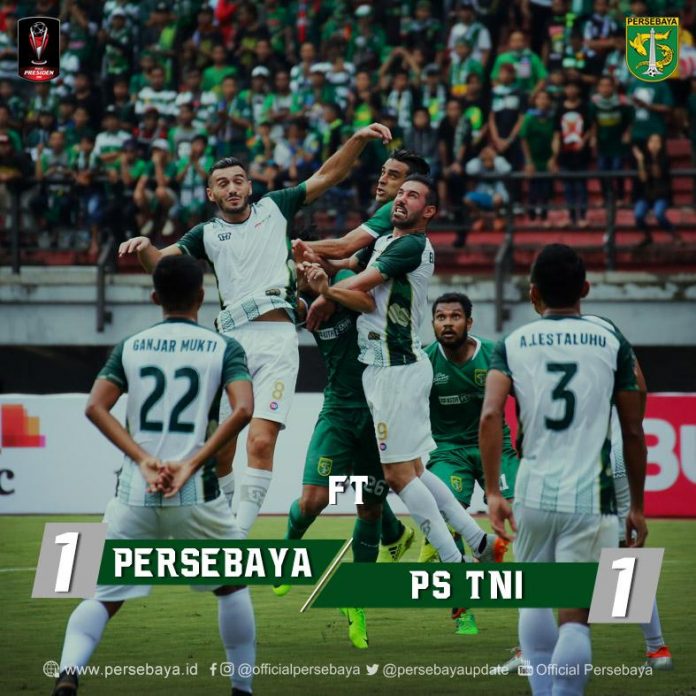 Surabaya, Nawacita – Persebaya Surabaya harus puas hanya bermain imbang 1-1 dengan PS TNI pada laga pembuka grup C Piala Presiden 2018 di Stadion Gelora Bung Tomo, Surabaya, Kamis (18/1). Pada laga itu, Persebaya sudah harus bermain dengan sepuluh pemain sejak menit ke-16 karena kiper Miswar Saputra diganjar kartu merah.