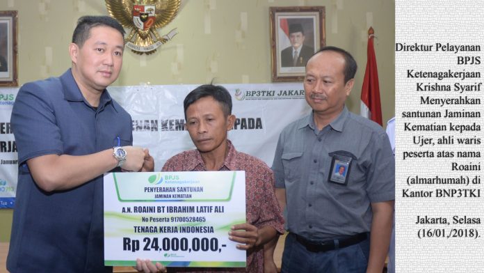 Salah satu bentuk jalannya tanggung jawab tersebut, BPJS Ketenagakerjaan melakukan penyerahan santunan Jaminan Kematian (JKm) senilai Rp 24 Juta kepada Ujer yang merupakan ahli waris dari peserta atas nama Roaini (alm). Santunan ini diserahkan langsung oleh Direktur Pelayanan BPJS Ketenagakerjaan Krishna Syarif bersama Deputi Direktur BPJS Ketenagakerjaan Wilayah DKI Jakarta – Achmad Hafiz, Kepala BPJS Ketenagakerjaan Cabang Jakarta Ceger – Dani Santoso, Kasubdit KTKLN BNP2TKI mewakili Direktur P2P BNP2TKI, dan Kasubag TU BP3TKI selaku PLH Ka BP3TKI Jakarta. ”Semoga santunan yang kami berikan dapat bermanfaat bagi keluarga yang ditinggalkan,” kata Krishna.