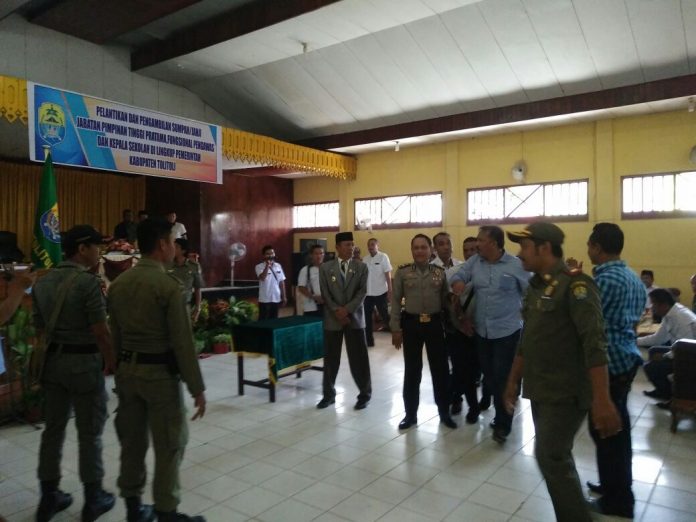 Suasana tenang pada pelantikan pejabat struktural dan fungsional pengawas kepala sekolah di Gedung Wanita Tolitoli itu tiba-tiba berubah mencekam setelah adanya keributan antara kedunya.