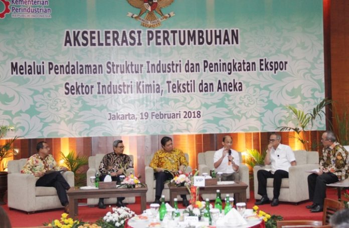 Menteri Perindustrian Airlangga Hartarto memberikan sambutan pada Breakfast Meeting Menperin dengan Pelaku Usaha Industri Kimia, Tekstil, dan Aneka di Kementerian Perindustrian, Jakarta, 19 Februari 2018. Dalam kesempatan tersebut, Menperin sampaikan sektor industri merupakan salah satu sektor yang mampu mendorong pertumbuhan ekonomi. Hal tersebut tercermin dari peranan sektor industri pengolahan di tahun 2017 yang mencapai 20,16% terhadap total PDB nasional. Selain itu, pada tahun 2018 pemerintah akan menargetkan pertumbuhan sektor industri pengolahan non migas sebesar 5.67% dengan total target investasi sebesar Rp. 345.4 Trilyun yang diharapkan adanya kontribusi dari sektor industri kimia, tekstil, dan aneka (IKTA) sebesar Rp.117 Trilyun terhadap total investasi.