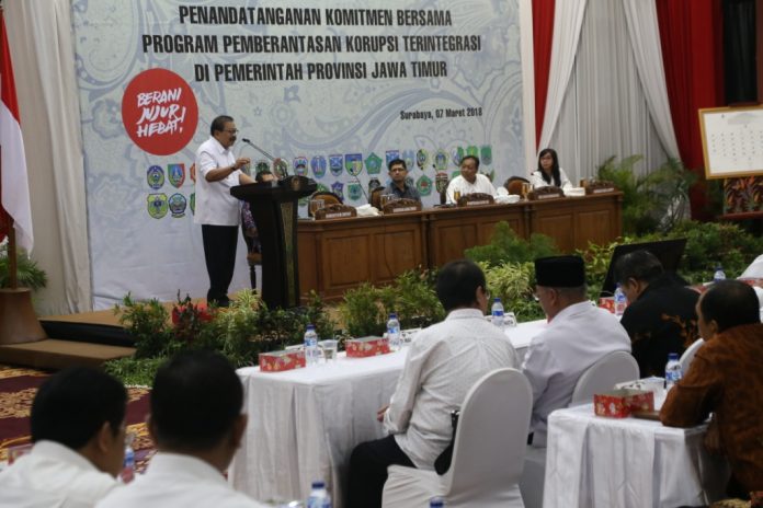 Nawacita.co – Gubernur Jawa Timur, Dr. H. Soekarwo bersama dengan Ketua DPRD Prov. Jatim, Kapolda Jatim, Kepala Kejaksaan Tinggi Jatim, Kepala Perwakilan BPKP Provinsi Jatim, serta Bupati/Walikota dan Ketua DPRD Kab/Kota se-Jatim terus berkomitmen memberantas korupsi terintegrasi di wilayah Jatim.