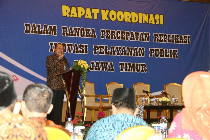 “Yang perlu dilakukan itu meniru inovasi pelayanan publik. Memang tidak semuanya sama, tapi misalnya persispun tidak jadi masalah. Sebab yang akan menilai adalah masyarakat kita,” ujar Sekdaprov Jatim Dr. H. Akhmad Sukardi, MM saat membuka Rakor dalam rangka Percepatan Replikasi Inovasi Pelayanan Publik di Jawa Timur, di Ballroom Hotel Wyndham Surabaya, Selasa (13/3) pagi.