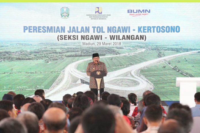 Nawacita.co – Gubernur Jawa Timur Dr. H. Soekarwo mendampingi Presiden Joko Widodo meresmikan Jalan Tol Ngawi-Kertosono seksi Ngawi-Wilangan sepanjang 51.95 Km. Peresmian dilangsungkan di depan gerbang tol (GT) Madiun Desa Bagi, Kec Sawahan, Kab. Madiun, Kamis (29/3) siang.