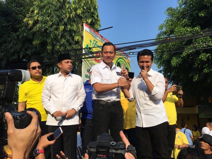Jombang, nawacita – Komandan Satuan Tugas Bersama (Kogasma) Partai Demokrat Agus Harimurti Yudhoyono ditemani Calon Wakil Gubernur Jawa Timur Emil Elistianto Dardak melepas pawai budaya di jalan KH Wahid Hasyim Jombang pada Minggu pagi (1/4/2018). Acara yang dihelat ditengah Car Free Day dihadiri ribuan massa anak-anak muda generasi milenial Jombang.