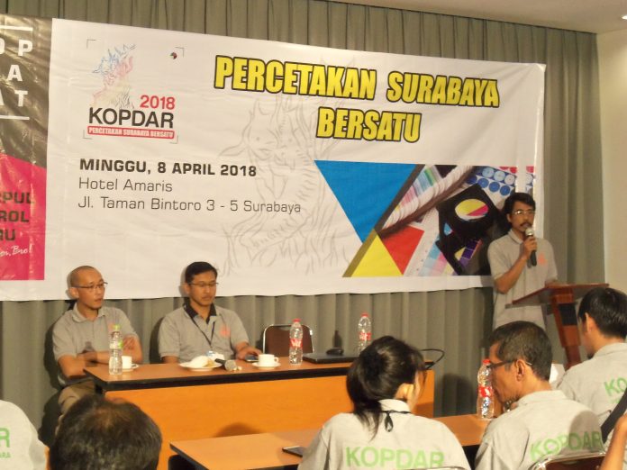 kami tidak bisa menghitung pastinya, tapi percetakan yang ada disurabaya banyak sekali tapi yang peduli ke asosisasi ini sangat minim termasuk yang tadi 75 percetakan, sebenarnya ada lebih ratusan percetakan yang peduli pada asosiasi ini, nantinya kita akan rangkul, jadi ini sudah terbentuk nanti kita akan datangi satu persatu  percetakan untuk bergabung dengan asosisasi ini, yaitu dengan syarat harus mempunyai NPWP dan SIUP,’’ ungkapnya