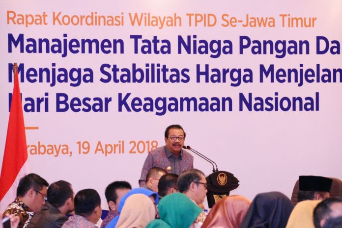 Nawacita.co – Dalam rangka memastikan terkendalinya inflasi Jawa Timur pada kisaran sasaran inflasi sebesar 3,5% ± 1% di tahun 2018, Tim Pengendali Inflasi Daerah (TPID) Provinsi Jawa Timur beserta seluruh TPID 38 Kota/Kabupaten melaksanakan rapat koordinasi High Level Meeting (HLM) TPID Jawa Timur. Kegiatan HLM sekaligus Rapat Koordinasi Wilayah (Rakorwil) TPID Se-Jawa Timur tersebut dihelat pada hari Kamis, 19 April 2018 dengan tema “Manajemen Tata Niaga Pangan dalam rangka Menjaga Stabilitas Harga Menjelang Hari Besar Keagamaan Nasional” dan dipimpin langsung oleh Soekarwo, Gubernur Jawa Timur selalu Ketua TPID Provinsi Jawa Timur bersama Enggartiasto Lukita, Menteri Perdagangan Republik Indonesia dan didampingi oleh Difi A. Johansyah, Kepala Perwakilan Bank Indonesia Provinsi Jawa Timur.