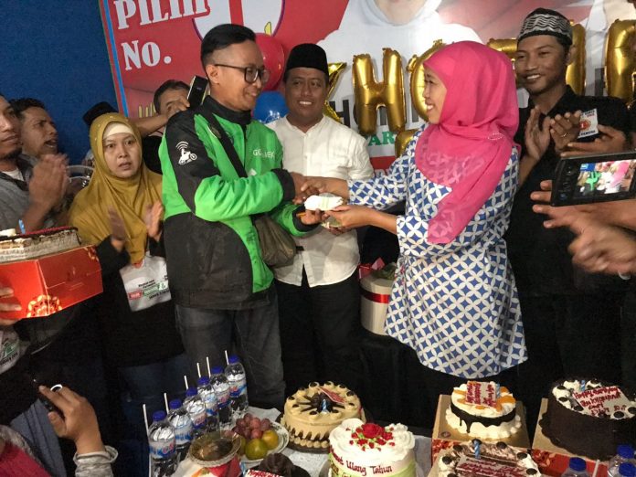 Khofifah yang awalnya mengajak sahur bareng para driver ojek online dari Gojek dan Grab, tiba tiba dihadiahi roti tart yang sudah disiapkan oleh Relawan KErta (Khofifah-Emil Karang Taruna). Puluhan driver ojek online yang biasa mangkal di seputaran Tengah Kota Surabaya itu, sengaja untuk syukuran bareng Khofifah yang sedang merayakan Hari Ulang Tahun. “Kami ingin Ibu Khofifah sehat terus dan terpilih jadi gubernur Jatim,” ucap Doni, Driver Gojek yang biasa mangkal di depan Tunjungan Plasa I.