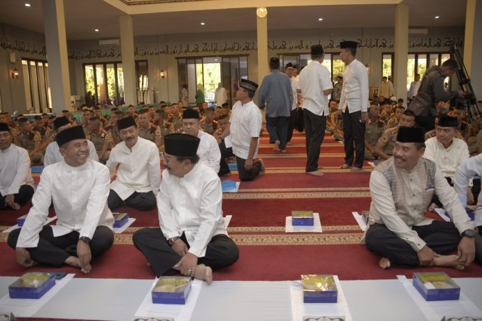 Nawacita.co – Gubernur Jawa Timur Dr. H. Soekarwo menghadiri buka puasa dan sholat magrib bersama Forum Komunikasi Pimpinan Daerah (Forum Komunikasi Daerah) Prov. Jawa Timut di Masjid Nurul Bahri Akademi Angkatan Laut/AAL, Surabaya, Senin (21/5). Selain Pakde Karwo-sapaan akrab Gubernur Jatim, kegiatan ini dihadiri a.l. oleh Pangdam V Brawijaya Mayjend TNI Arif Rahman, Kapolda Jatim, Irjen Pol. Machfud Arifin, Komandan KODIKLATAL Laksamana Muda TNI Darwanto, Pangamartim Laksamana Muda TNI Didik Setiyono, dan Gubernur AAL Laksamana Muda TNI Wuspo Lukito.
