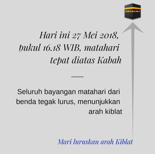 “Saudaraku umat Islam seluruh Indonesia, ayo saatnya kita kalibrasi kembali arah Kiblat kita. Sore ini pukul 16.18 WIB, matahari berada tepat di atas Kabah, artinya seluruh bayangan matahari dari benda tegak lurus, menunjukkan arah Kiblat,” tulis akun Twitter Kemenag.