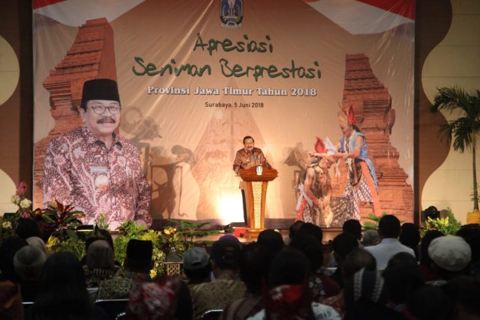 “Para budayawan dan seniman telah banyak memberikan kontribusi dalam mengembangkan seni budaya di Jatim secara luar biasa. Mereka inilah yang membuat Jatim, selama hampir 10 tahun saya memimpin, menjadi tenang, aman dan nyaman,” terang Pakde Karwo, sapaan lekat Gubernur Jatim saat menghadiri acara Apresiasi Seniman Berprestasi Provinsi Jatim Tahun 2018 di Graha Wisata, Kantor Dinas Kebudayaan dan Pariwisata Provinsi Jatim, Selasa (5/6) pagi.
