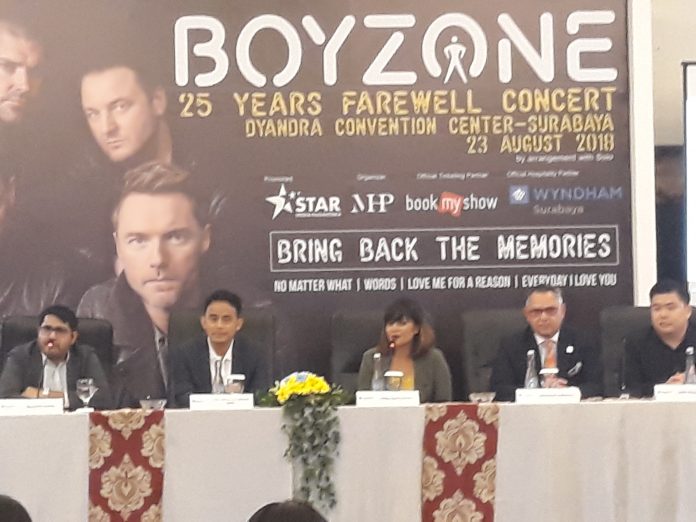 Boyzone Asia Tour, dlmana konser ini akan menjadl konser terakhir Boyzone sete|ah 25 tahun berkarya. Sebagai Offical promotor dari konser Boyzone di Surabaya ini, kami sangat yakin, konser ini akan menjadi momen yang akan dikenang sepanjang masa,” ungkap Lina Priscilla, semangat.