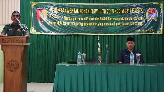Gresik,Nawacita.co – Kodim 0817/Gresik dalam menjalankan tugas pokok fungsi satuannya telah berhasil menggelar kegiatan Pembinaan Mental Rohani TW III TA. 2018 bertempat di Aula Brigjen TNI Roematullah Makodim 0817/Gresik tepatnya pada pukul 08.00 WIB dengan mengundang nara sumber dari satuan Bintaldam V/Brawijaya Drs. H. Munir.