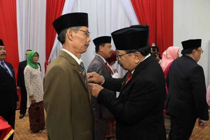 Surabaya,Nawacita.co – Dalam rangka memperingati HUT Kemerdekaan RI ke-73 , Presiden RI, Joko Widodo memberikan tanda kehormatan Satyalencana Karya Satya kepada 200 orang ASN di Jatim. Penyerahan penghargaan dilakukan Gubernur Jatim, Dr. H. Soekarwo kepada para penerima di Gedung Negara Grahadi, Rabu(15/8). Pemberian penghargaan Satyalencana Karya Satya inu diberikan berdasarkan Keputusan Presiden RI Nomor 35/TK/Tahun 2018 tentang Penganugerahan Tanda Kehormatan Satyalencana Karya Satya