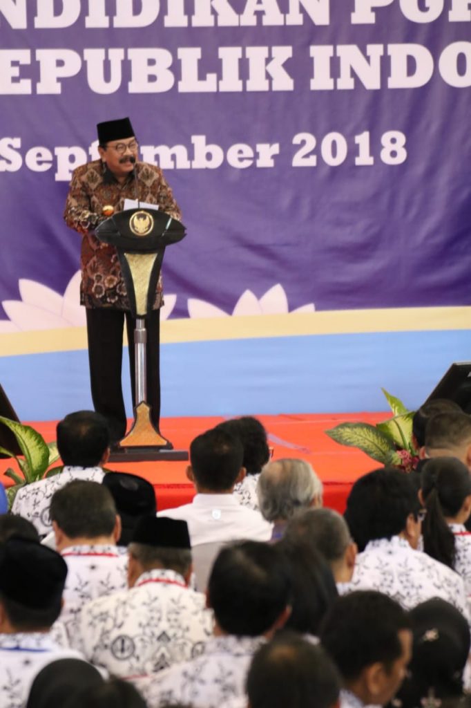 Hal tersebut disampaikan Gubernur Jawa Timur Dr. H. Soekarwo saat memberikan sambutan dihadapan Presiden Republik Indonesia Ir. H. Joko Widodo pada acara Kuliah Umum Wawasan Kebangsaan dan Pembukaan Rakernas Lembaga Pendidikan PGRI di Universitas PGRI Adi Buana Surabaya, Kamis (6/9).