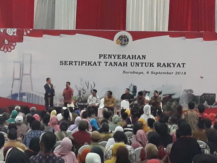 Pada kesempatan tersebut, Jokowi sapaan akrab Presiden RI menyerahkan sertifikat tanah untuk rakyat kepada 5.000 penerima yang berasal dari beberapa wilayah diantaranya Sidoarjo dan Gresik.”Coba sertifikatnya diangkat tinggi-tinggi agar kelihatan semua sertifikat sudah diserahkan,” tutur Jokowi.