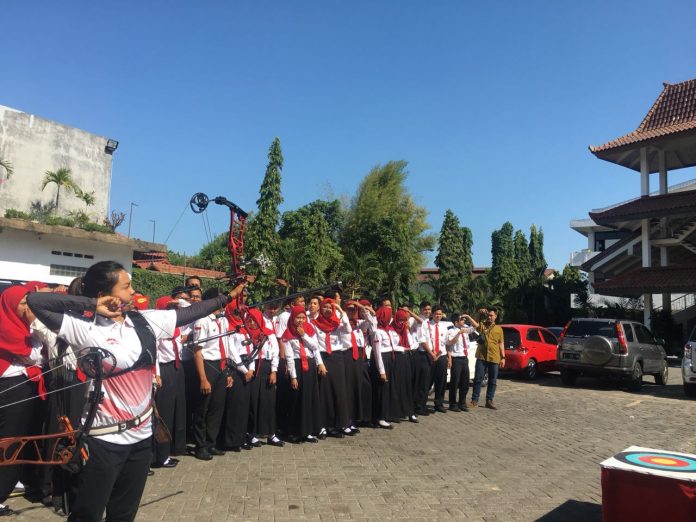 Ega, Dinda, dan Yoke memanah sasaran berupa balon yang kemudian membuka gulungan banner bertuliskan seluruh fakultas di UNNAR dan ucapan selamat datang pada mahasiswa baru di depan Ketua Yayasan Pawiyatan Gita Patria, Hj. Rr. Iswachyu Dhaniarti DS.ST.,M.HP.