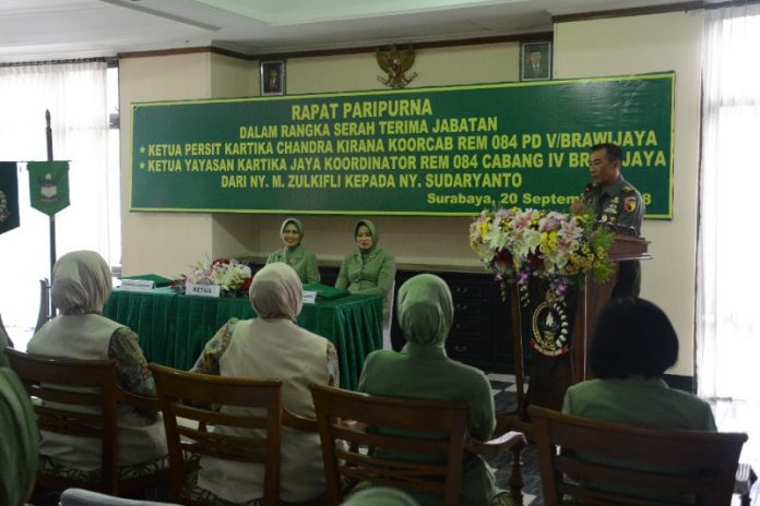 Surabaya,Nawacita.co – Sebelumnya dijabat oleh Dewi Zulkifli, kini, jabatan Ketua Dharma Pertiwi Koorcab Surabaya daerah E, secara resmi dialihkan. Pengalihan itu, ditandai dengan adanya serah terima jabatan (sertijab) Ketua Dharma Pertiwi yang digelar di gedung Balai Prajurit, Makodam V/Brawijaya, Kota Surabaya. Kamis, 20 September 2018.