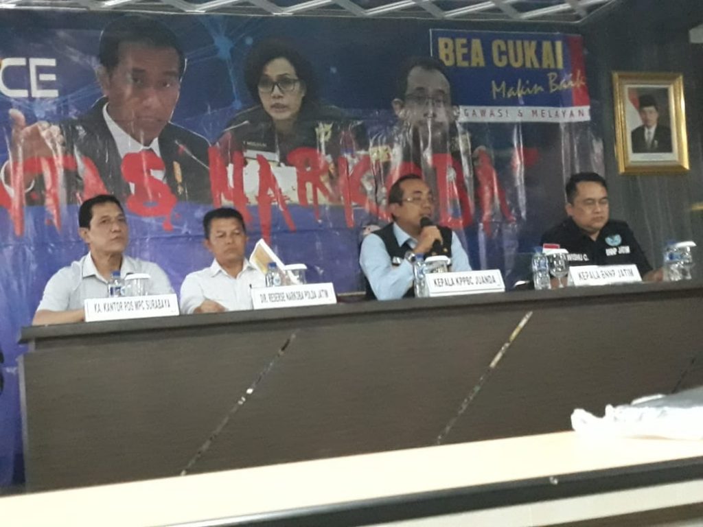 Pada kesempatan ini, kami mengucapkan banyak terima kasih dan memberikan apresiasi setinggi -tingginya kepada semua pihak antara lain Direktorat Jenderal Bea dan Cukai (CNT KPPBC Tipe Madya Pabean Juanda, Kantor WiLayah DJBC Jawa Timur I), PT. Pos Indonesia, PT. Angkasa Pura, Polda Jatim dan BNNP Jatim, Balai Pengujian dan ldentifikasi Barang (BPIB) Tipe B Surabaya dan Balai Pengujian dan Identiflkasi Barang (BPIB) Tipe A Jakarta yang telah bekerjasama memberantas peredaran Narkoba. Tentunya tanpa adanya sinergi antar institusi,upaya pemberantasan Narkoba tidak akan maksimal.” kata Kepala KPPBC TMPJ Budi Harjanto