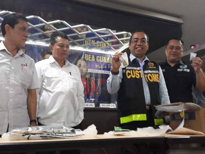 Maka dengan ini kami Seluruh petugas Bea Cukai selalu meningkatkan pengawasan dalam rangka mengantisipasi berbagai macam modus yang dilakukan oieh para kurir narkoba, salah satu modus mereka lakukan dengan mengunakan jasa pengiriman luar negeri misalnya PT Pos Indonesia, DHL,TNT dan lain sebagainya. hal ini disampaikan ketika pada acara Press conference di Kantor Wilayah DJBC Jawa Timur I juanda Surabaya kamis (04/10) siang.