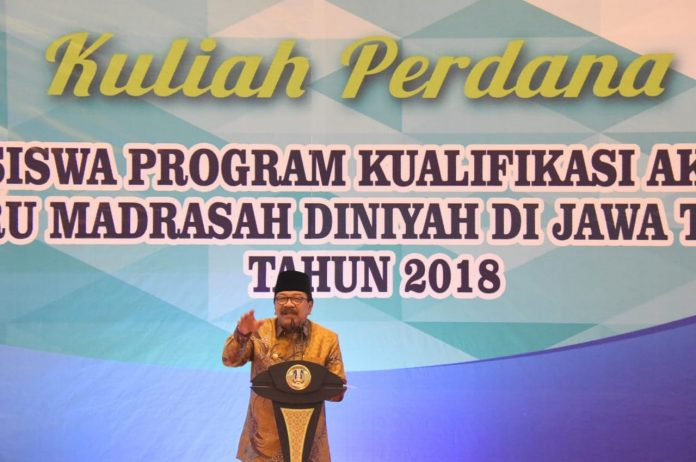 Demikian disampaikan Gubernur Jatim, Dr. H.s Soekarwo saat memberikan Kuliah Perdana Mahasiswa Program Kualifikasi Akademik Guru Madrasah Diniyah di Jawa Timur Tahun 2018 di Gedung Islamic Center, Surabaya, Kamis (18/10).