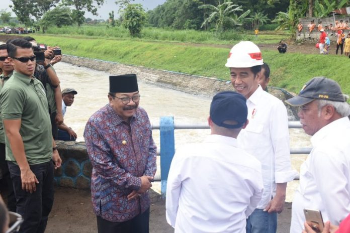 Blitar, Nawacita.co – Gubernur Jatim, Dr. H. Soekarwo mendampingi Presiden RI, Joko Widodo (Jokowi) meninjau proyek rehabilitasi daerah irigasi Lodoyo, di Kelurahan Jegu, Kecamatan Sutojayan, Kabupaten Blitar, Kamis (3/1).