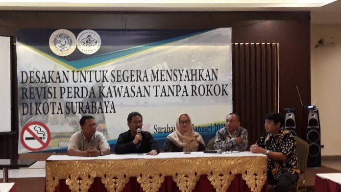 Maka dari itu Tobacco Control Support Center Ikatan Ahli Kesehatan Masyarakat Indonesia (TCSC – IAKMI) Jawa timur kembali mendesak legeslatif DPRD Surabaya untuk segera mengesahkan Perda kawasan Tanpa Rokok dan kawasan Terbatas merokok ( KTR/ KTM) Pembahasan keterangan ini disampaikan pada saat Prees conference di Pawon Resto Rempah Rabu ( 16/1/ 2019) Siang.