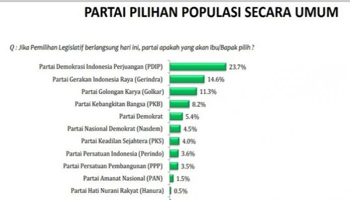 PDIP menjadi parpol yang terbanyak dipilih dengan elektabilitas 23,7%. Menyusul dibelakangnya ada Gerindra yang mendapat 14,6% dukungan.