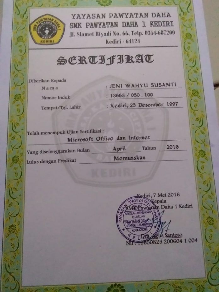 Tidak hanya itu, Jeni juga memiliki setifikat dan surat keterangan ketrampilan mengoperasikan komputer dari lembaga tempat Jeni magang dalam Praktek Kerja Lapangan (PKL).