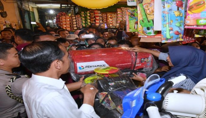 Kedatangan Presiden dan Ibu Iriana disambut riuh para pedagang dan pengunjung plaza tersebut. Keduanya pun tak sungkan melayani permintaan salaman dan foto dari masyarakat.