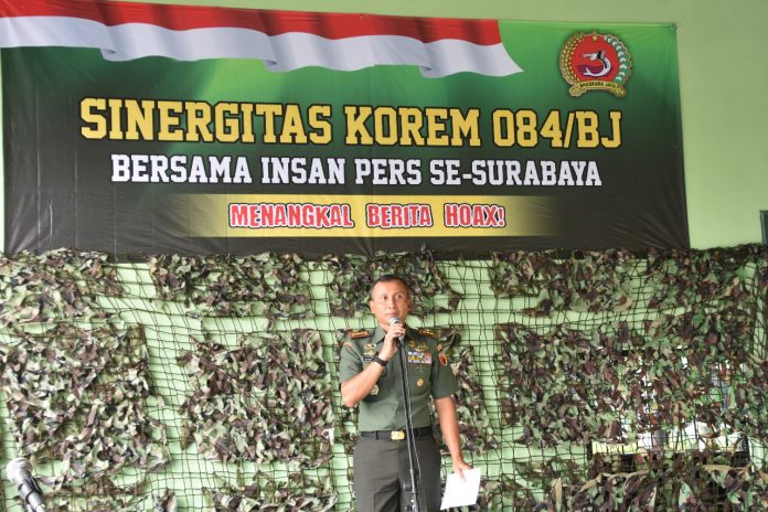 Surabaya, nawacita.co- Danrem 084/Bhaskara Jaya Kolonel Inf Sudaryanto, SE terus mengajak seluruh insan Pers di wilayah Se-Surabaya untuk selalu Sinergitas menangkal berita-berita hoax dan mengajak peran serta media massa elektronik cetak maupun online sebab media mempunyai peran penting dalam kehidupan sosial, apalagi sebentar lagi akan diadakan Pesta demokrasi 2019. kegiatan ini berlangsung di lapangan tembak yang sudah direnovasi Rabu (20/3) pagi