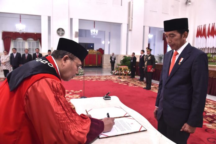 Jakarta,nawacita – Presiden Joko Widodo menyaksikan pengucapan sumpah jabatan oleh Aswanto dan Wahiduddin Adams yang resmi menjabat sebagai Hakim Konstitusi untuk periode 2019 hingga 2024.