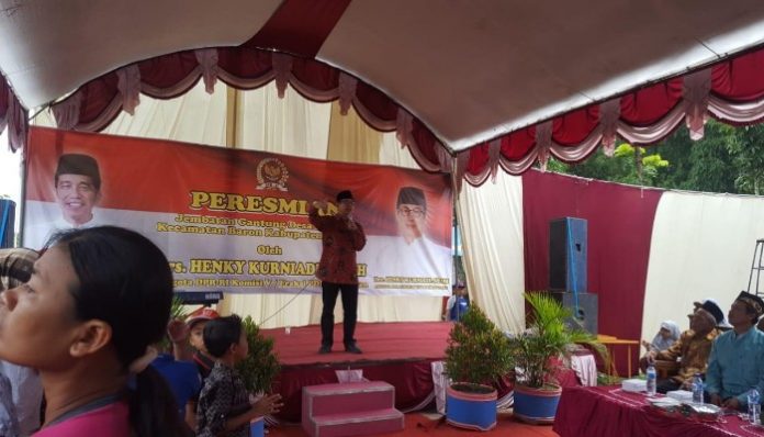 NGANJUK, Nawacita – Sore tepi sungai widas desa Mabung, warga menyambut kedatangan Henky Kurniadi Anggota Dewan Perwakilan Rakyat Republik Indonesia (DPR RI) Komisi V Fraksi Partai Demokrasi Indonesia Perjuangan (PDIP) yang akan meresmikan Jembatan Gantung.
