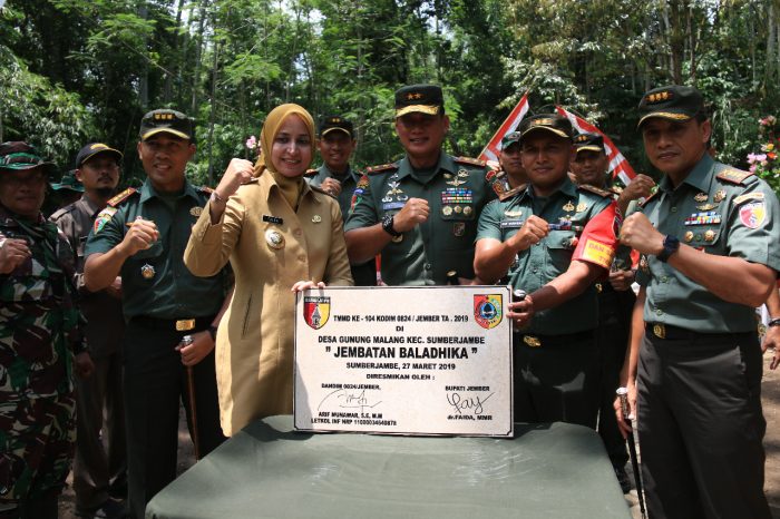 JEMBER, nawacita – Jembatan baru yang dibangun olah Satuan Tugas TNI Manunggal Membangun Desa (Satgas TMMD) yang berada di Dusun Karang Kebun Desa Gunungmalang Kec Sumberjambe Kab Jember sekaligus diresmikan.