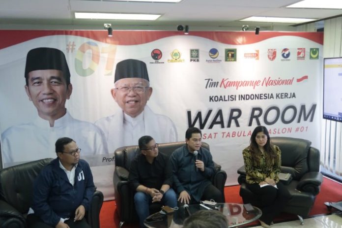 “Di sini, semua media bisa melihat bahwa hasil perhitungan kami yang menunjukkan bahwa Jokowi – Ma’ruf Amin unggul dalam real count tidak jauh berbeda dengan perhitungan riil KPU. Bahkan tak jauh berbeda dengan quick count beberapa lembaga survey,” jelas Erick dalam press briefing dengan media asing di War Room TKN.