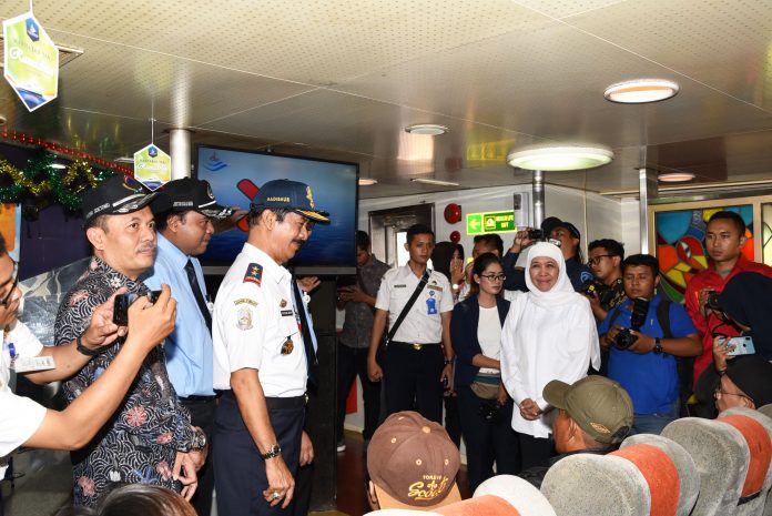Surabaya,Nawacita – Gubernur Jawa Timur Khofifah Indar Parawansa melepas 460 penumpang mudik dan balik gratis jalur laut tujuan Kec. Masalembu, Kab. Sumenep. Prosesi pelepasan mudik dengan Kapal Dharma Kartika III tersebut diberangkatkan di Gapura Surya Nusantara Surabaya, Rabu (29/5).