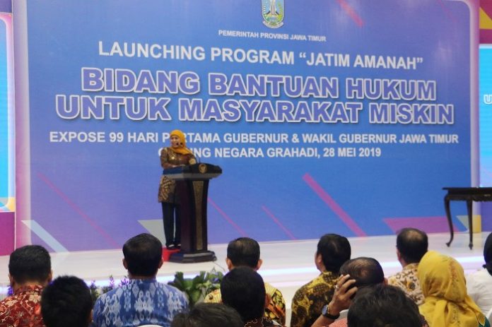“Salah satu konsentrasi kami kedepan adalah memberikan bantuan hukum pro bono atau gratis kepada masyarakat miskin dan tidak mampu yang mengalami masalah hukum,” ujarnya saat Launching Program Jatim Amanah, Bidang Bantuan Hukum untuk Masyarakat Miskin, Expose 99 Hari Pertama Gubernur dan Wakil Gubernur Jatim di Gedung Negara Grahadi, Surabaya, Selasa (28/5).