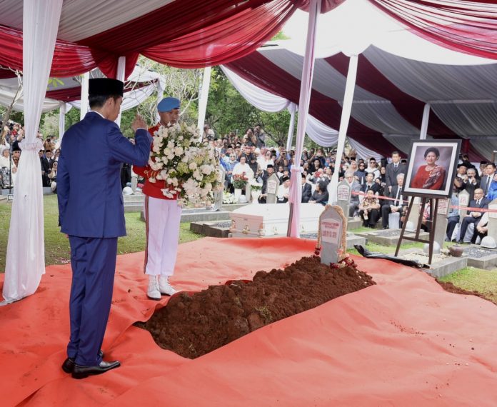 Presiden kemudian secara simbolis memulai penimbunan liang lahad yang diikuti oleh anggota keluarga. Prosesi upacara dilanjutkan dengan peletakan karangan bunga berturut-turut oleh Presiden Jokowi, SBY dan pihak keluarga.
