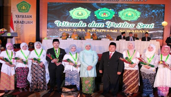 Surabaya, Nawacita – Gubernur Jatim Bunda Khofifah Sapaan akrabnya meminta para lulusan SMP dan SMA Khadijah Surabaya Tahun Ajaran (TA) 2018/2019 untuk menjaga tiga janji dan komitmen wisudanya. Ketiga janji dan komitmen tersebut yakni menjaga iman dan taqwa, menjaga Negara Kesatuan Republik Indonesia (NKRI), serta menjaga kemuliaan Islam melalui nilai-nilai Ahlussunah Wal Jama’ah di tengah-tengah masyarakat.