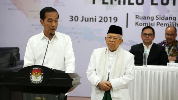 “Menetapkan pasangan capres dan cawapres 01 saudara Ir H Joko Widodo dan KH Ma’ruf Amin dengan perolehan 85.607.362 suara atau 55,50 persen dr total suara sah nasional sebagai pasangan presiden dan wapres terpilih periode 2019 2024,” Kata Ketua KPU Arief Budiman.