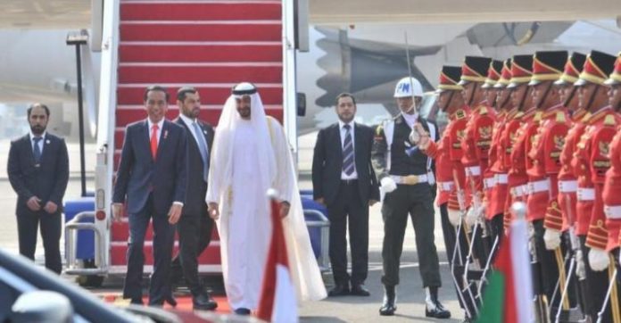 Jokowi menyambut langsung kedatangan Pangeran Sheikh Mohamed dengan didampingi Menteri Luar Negeri Retno Marsudi, Menteri ESDM Ignasius Jonan, dan Gubernur Banten Wahidin Halim.