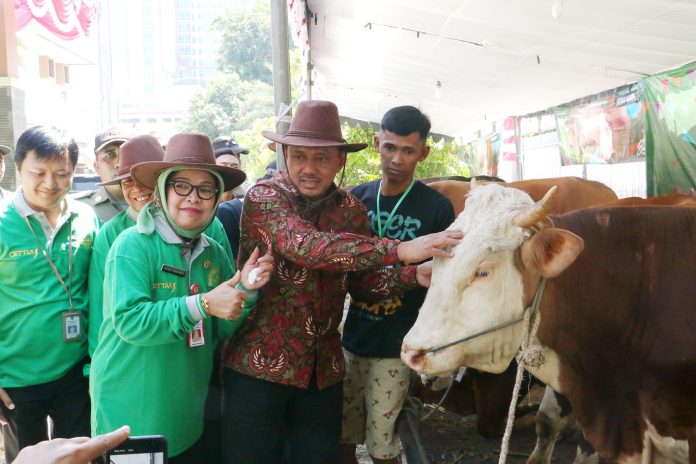 “Pesan ibu Gubernur Khofifah, setiap hewan qurban yang ada di Jatim harus terjaga kesehatannya dan sebelum dilakukan penyembelihan harus dilakukan dengan baik dan benar, sehingga menghasilkan daging yang halal ketika dikonsumsi oleh masyarakat,” ungkap Sekdaprov Heru Tjahjono saat membuka Bazar Ternak Qurban dan Pelepasan Tim Pemeriksaan Ante Mortem -Post Mortem Tahun 2019 di Kantor Dinas Peternakan Prov. Jatim, Jl. Ahmad Yani 202 Surabaya, Kamis (8/8).